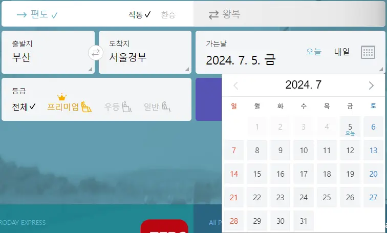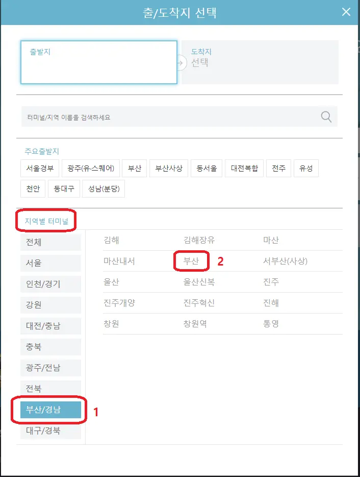 2-1 출발지를 부산으로 선택하고 도착지를 서울 경부로 선택합니다.